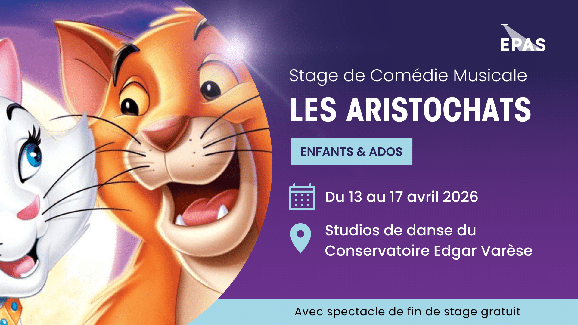 Ouvert sans prérequis de niveau, le stage de comédie musicale pour enfants & ados est axé sur la découverte du théâtre, du chant, de la danse et du corporythme. Il marqué par un spectacle en fin de semaine sur le thème « LES ARISTOCHATS ».