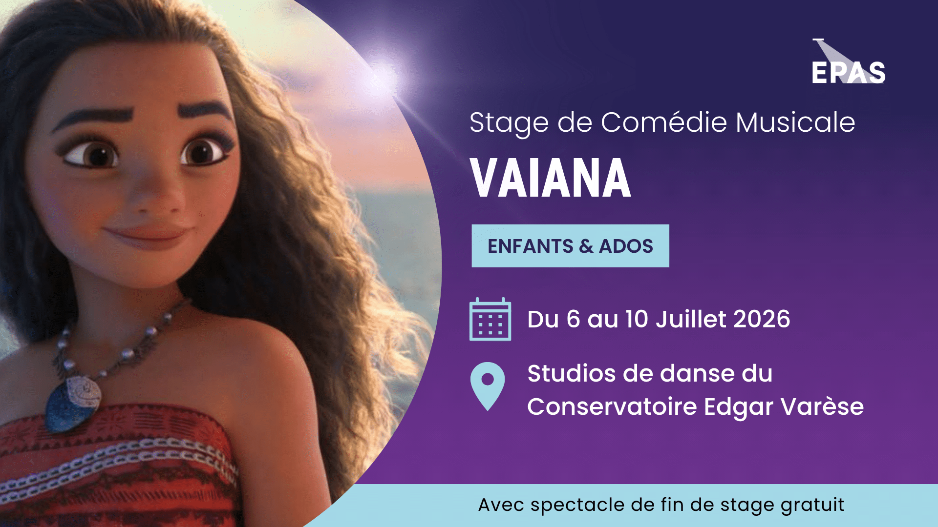 Ouvert sans prérequis de niveau, le stage de comédie musicale pour enfants & ados est axé sur la découverte du théâtre, du chant, de la danse et du corporythme. Il marqué par un spectacle en fin de semaine sur le thème « VAIANA ».