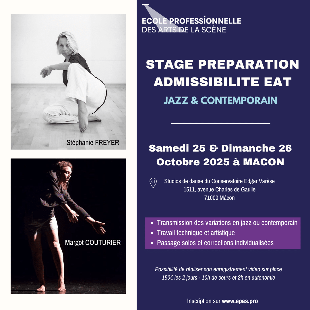 L' EPAS propose pour la 1ère année un stage de 2 jours de préparation à l'étape d'admissibilité pour l' Examen d'Aptitude Technique dans les options JAZZ et CONTEMPORAIN. Ce stage aura lieu le samedi 25 et dimanche 26 octobre 2025 dans les studios de danse du Conservatoire Edgar Varèse de Mâcon.